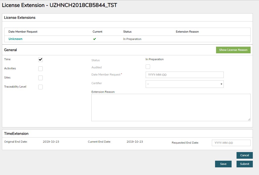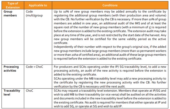 認証文書の有効期間内に発生する何らかの増加(数量やグループメンバーの数、拠点や回数の増加)に関する認証情報の変更は、ライセンス範囲の拡大・延長を通じて追加することができます。 範囲拡大・延長監査は、追加数量または新たな加工活動、および/または新たなエリアおよび/またはグループメンバーを認証文書に追加するための認証の方法を提供します。 MultiTraceでは一回に一つの延長・拡大の提出が可能ですのでご注意ください。CBは、メンバーの現行の認証文書およびライセンスの有効期限が切れる前にMultiTraceでライセンス範囲の拡大・延長を申請しなければなりません。 ライセンス範囲の拡大・延長は、「監査およびライセンス申請」タブから行ってください。「ライセンス」までスクロールダウンして、メンバーを検索してください。必ず正しい検索フィルタを使用してください(例、現在有効なライセンスを探すのであれば「有効」を選択)。 「ライセンス延長」をクリックして進みます。 これに含まれるべき情報と文書は以下の通りです: -範囲拡大・延長理由 -監査日(「監査済」にチェックマークが入っている場合) -最新のグループメンバー一覧(グループ拡大の場合) ライセンス範囲の拡大・延長が申請され、申請が承認されると、メンバーには自動的に通知メールが送られます。 次の表は可能な範囲拡大・延長の種類を示しています:以下に示された拡大・延長を2つ以上組み合わせることも可能です。